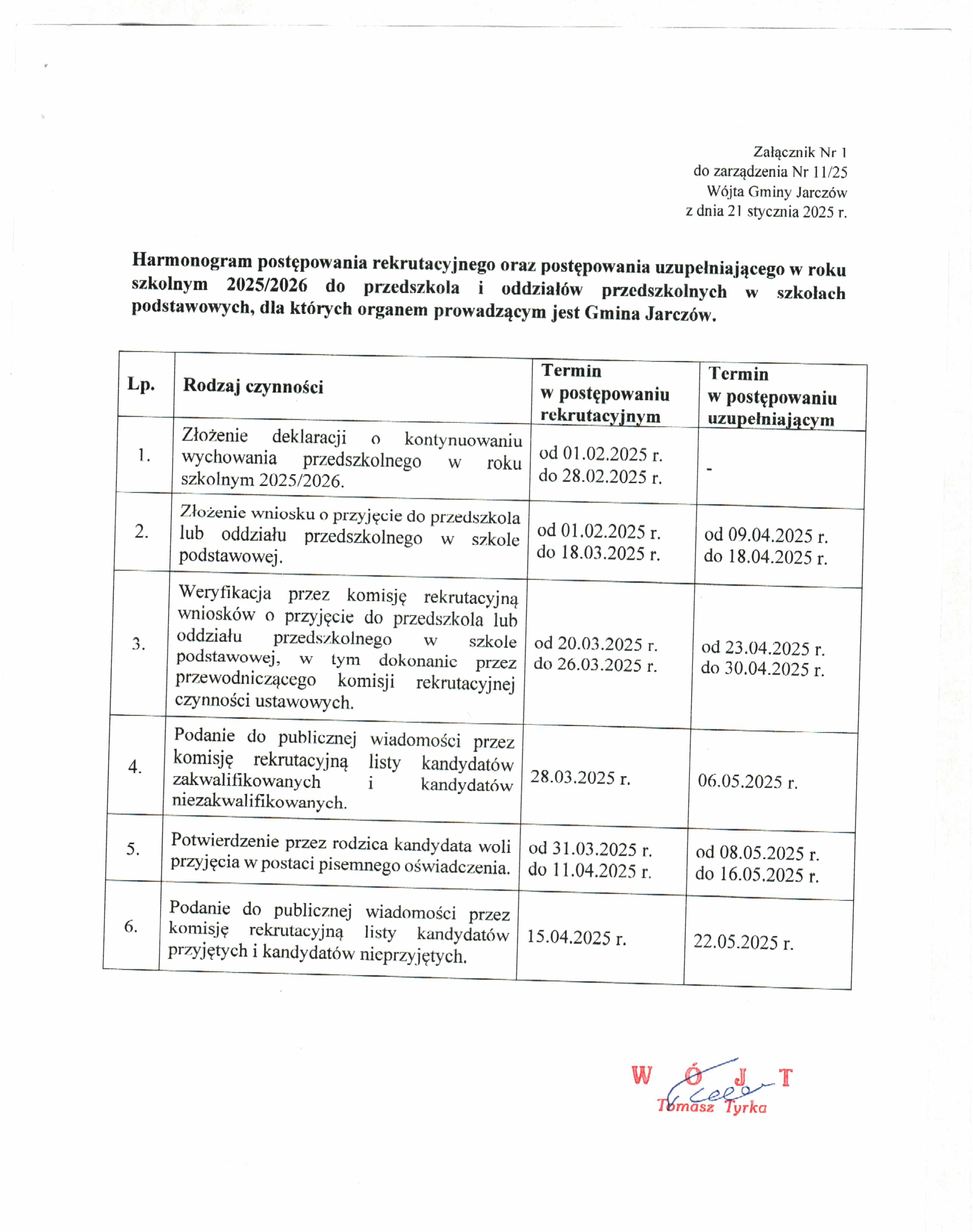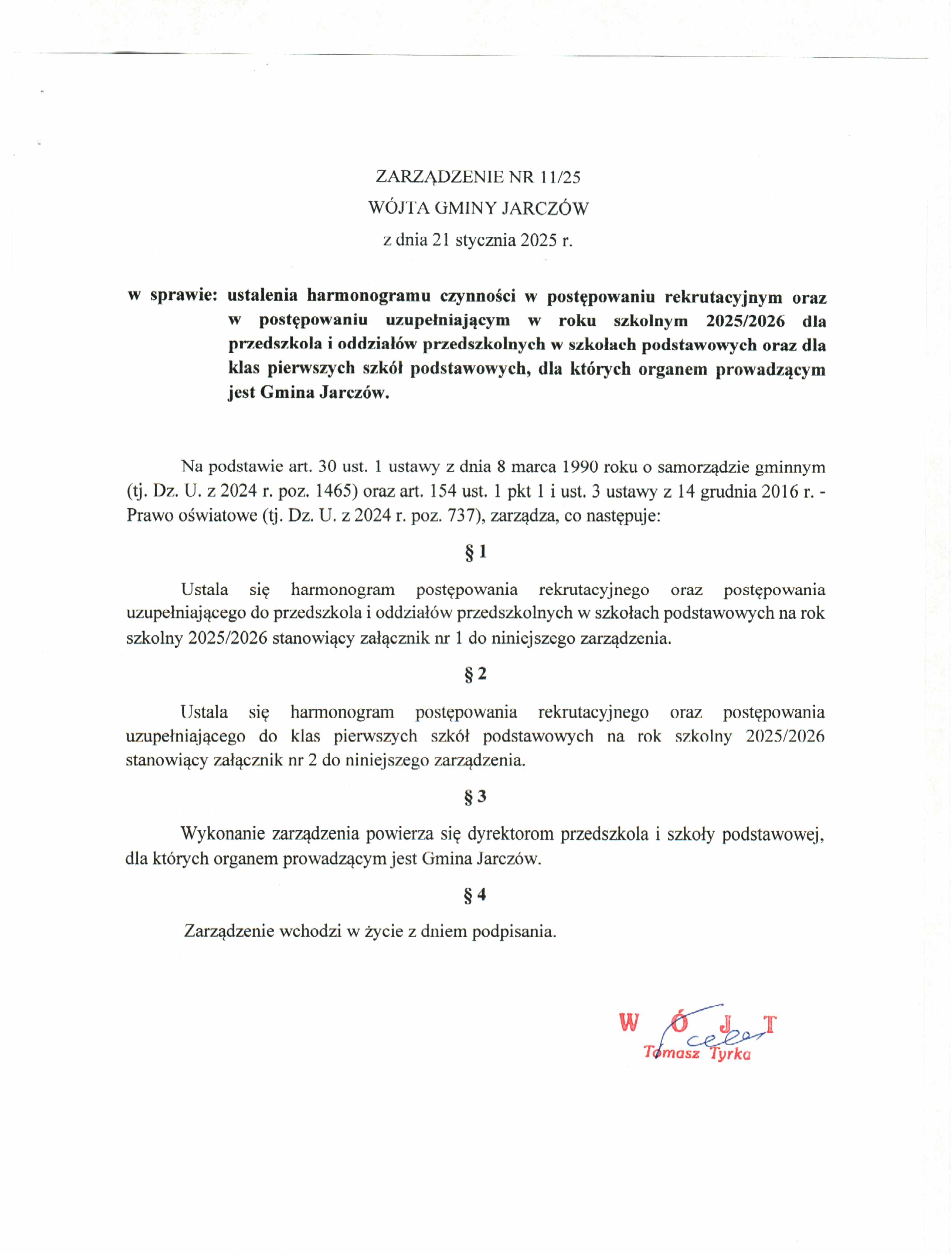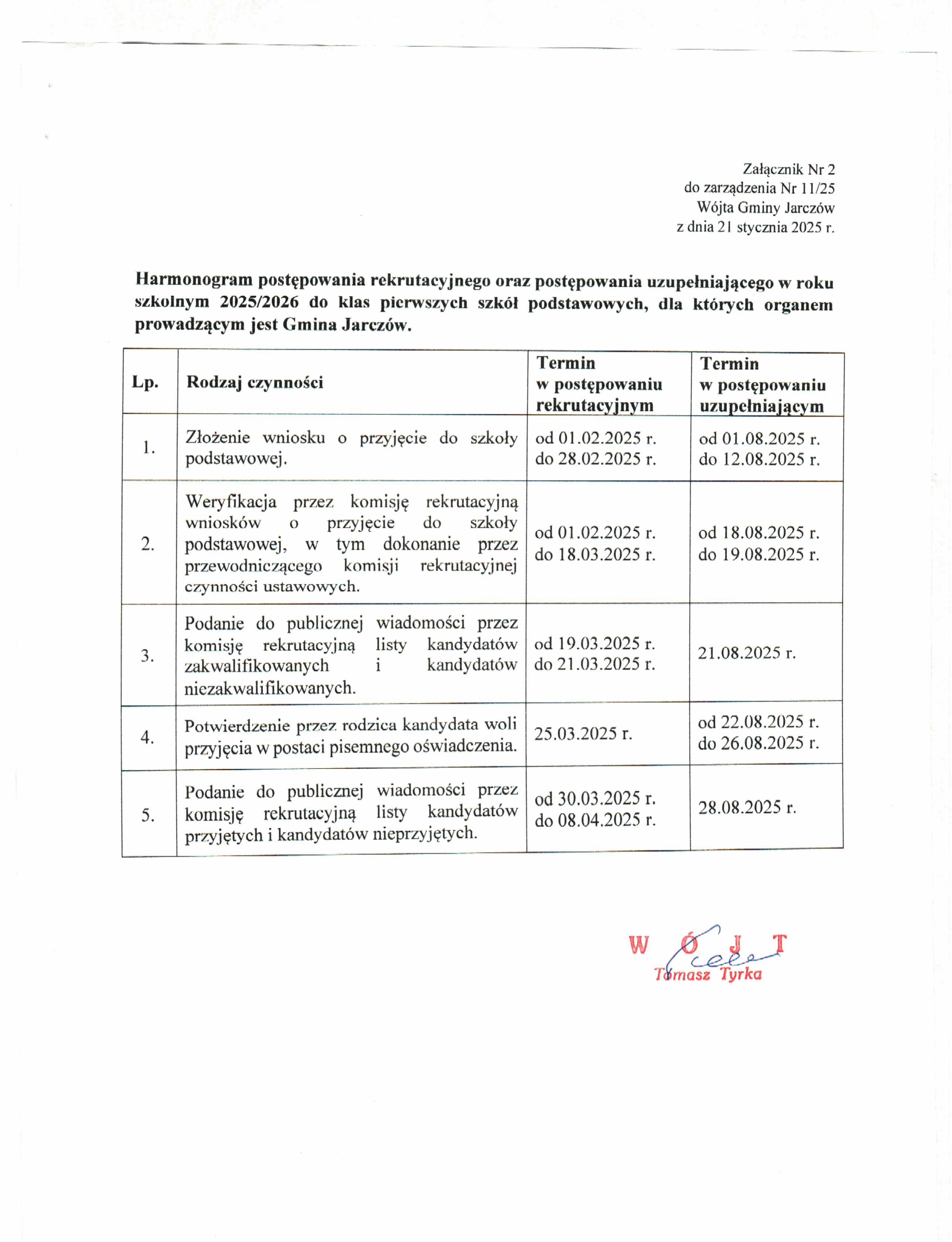 Zarządzenie Wójta Gminy Jarczów w sprawie harmonogramu czynności w postępowaniu rekrutacyjnym w szkole podstawowej |