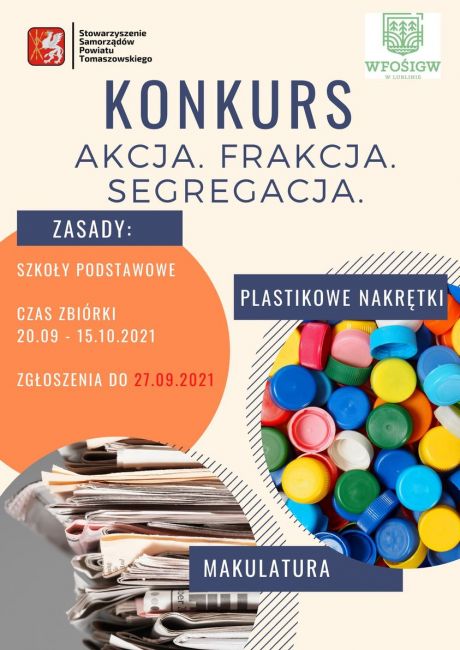 W roku szkolnym 2021/2022 nasza szkoła przystępuje do udziału w konkursie ekologicznym, którego organizatorem jest Stowarzyszenie Samorządów Powiatu Tomaszowskiego ,,Akcja. Frakcja. Segregacja.” Konkurs polega na zebraniu przez społeczność szkolną, jak największej ilości odpadów w postaci makulatury oraz plastikowych nakrętek.