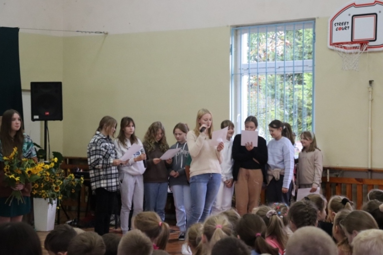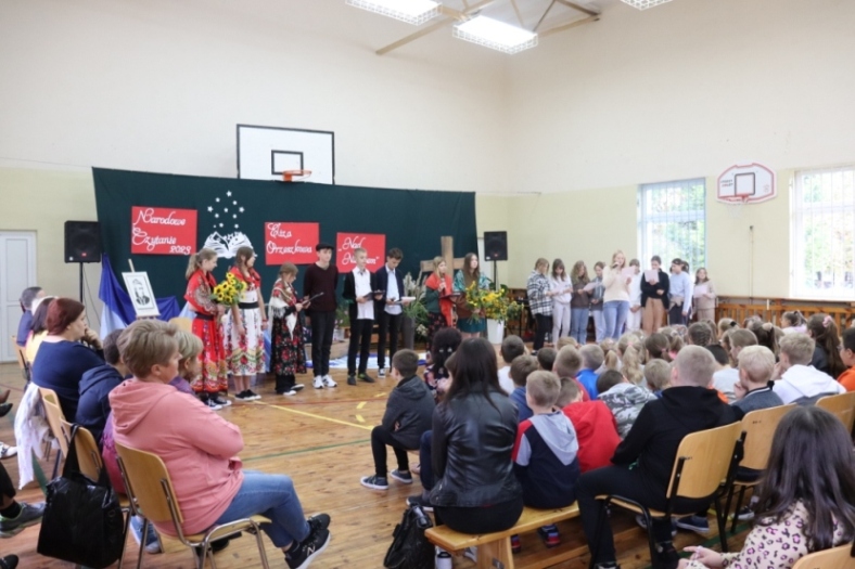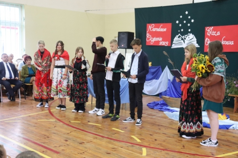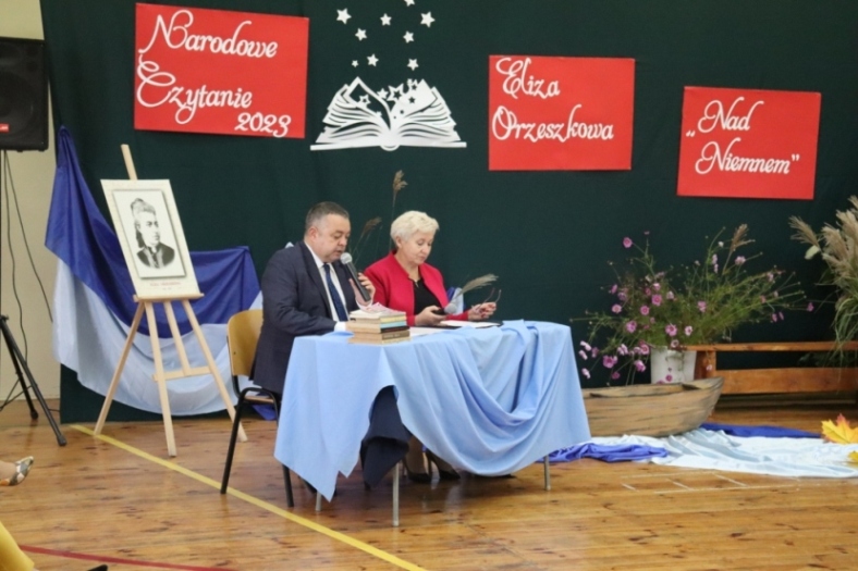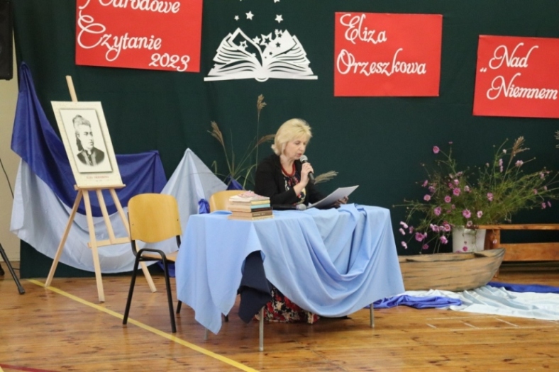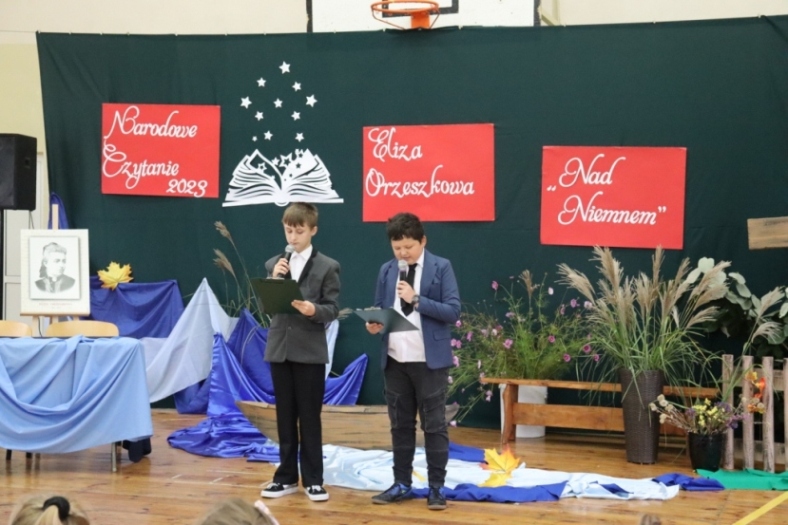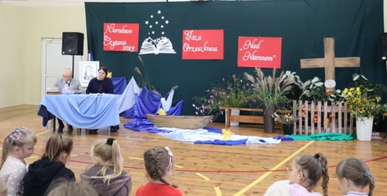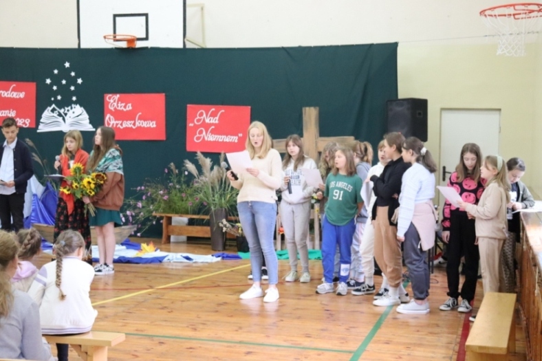 J. Maryńczak i A. Dziedzic-Koperwas. Wybrany fragment lektury zainscenizowali uczniowie klasy VII, wspierani wokalnie przez dziewczynki ze szkolnego kółka muzycznego. Dekoracja sali przedstawiała nadniemeński krajobraz.