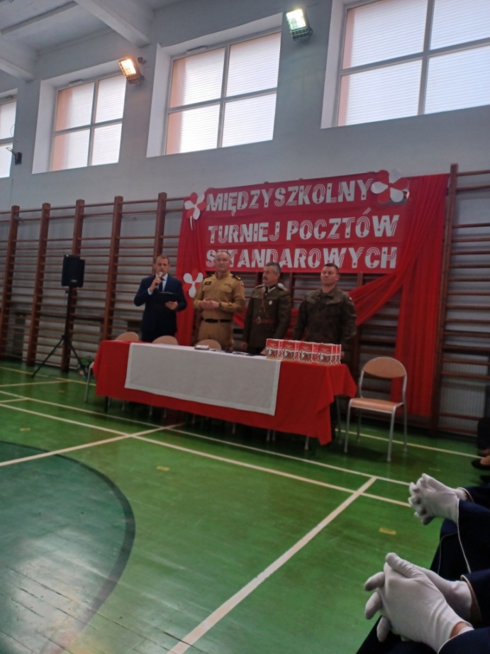 Uczestnicy w pierwszym etapie rywalizacji mierzyli się indywidualnie z testem wiedzy na temat symboli narodowych oraz zasadach ceremoniału szkolnego. Podczas drugiego etapu uczniowie prezentowali swoje umiejętności manewrowania sztandarem zgodnie z zasadami musztry pod czujnym okiem jury, w skład którego wchodzili przedstawiciele służb mundurowych. Głównymi celem Turnieju było: propagowanie i utrwalanie wzorców zachowania młodzieży w trakcie uroczystości państwowych, religijnych i szkolnych z udziałem Pocztu Sztandarowego, poznanie zasad znajomości musztry i ceremoniału pocztów sztandarowych oraz kształtowanie postaw i uczuć patriotyczno – moralnych. Udział w rywalizacji międzyszkolnej był poprzedzony szkoleniem podczas, którego członkowie Pocztu uczyli się prawidłowo poruszać ze sztandarem i salutować, które prowadził p. Stanisław Koper – przedstawiciel Tomaszowskiego Szwadronu im. 1-go PK KOP.