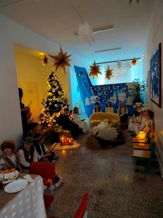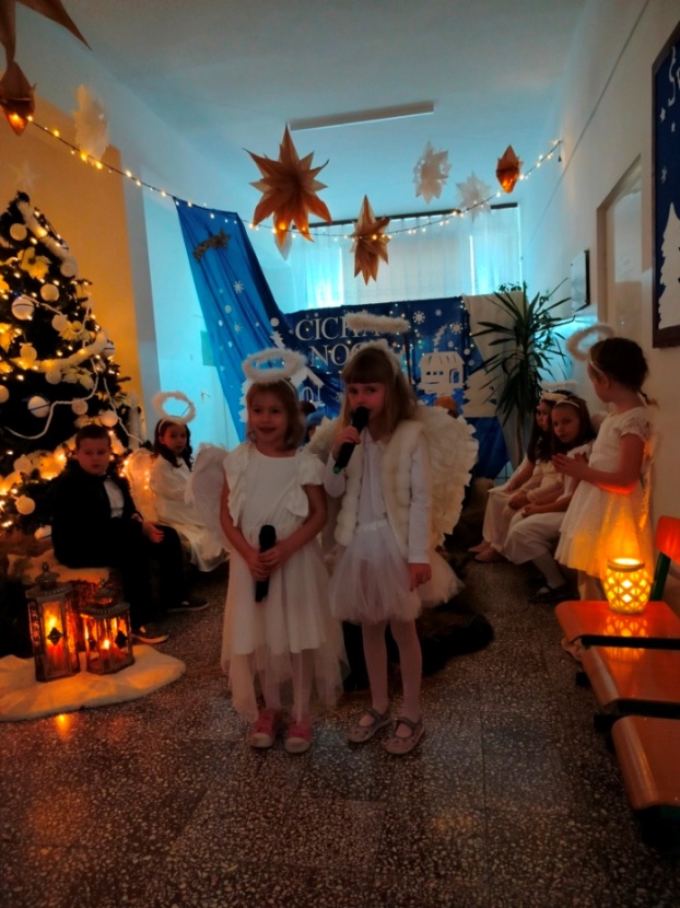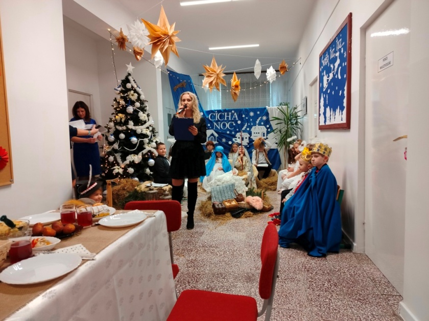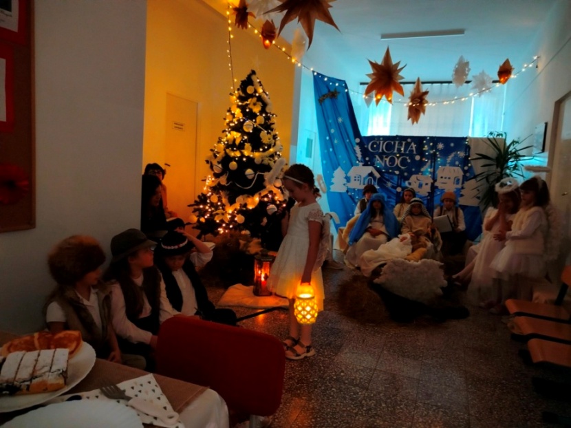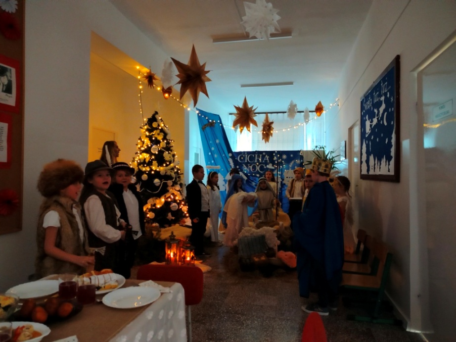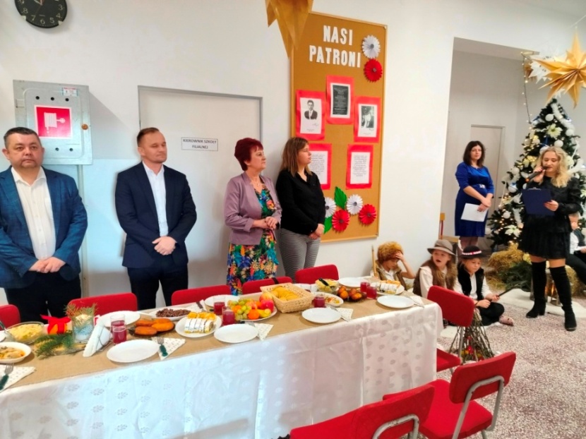 Po zakończonej części artystycznej wszyscy zostali nagrodzeni brawami. Następnie głos zabrała Pani Dorota Czop Kierownik Szkoły Filialnej, która podziękowała młodym artystom oraz ich opiekunom za wprowadzenie w atmosferę Świąt Bożego Narodzenia, a rodzicom za trud włożony w przygotowanie wigilijnych potraw, które gościły na stole. Złożyła świąteczne życzenia przybyłym na uroczystość gościom, rodzicom, uczniom i nauczycielom.