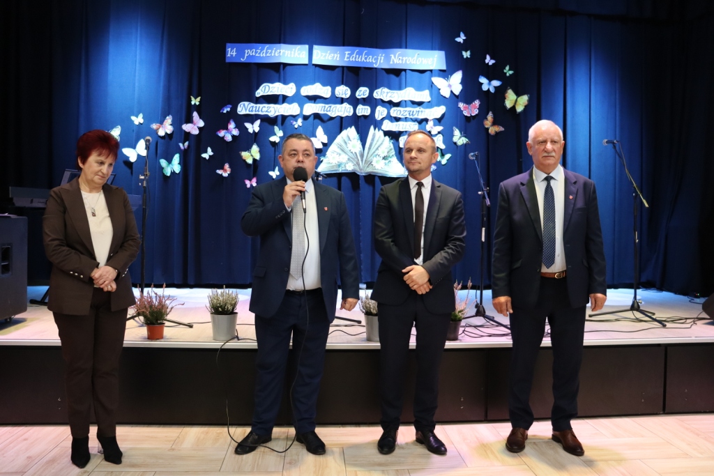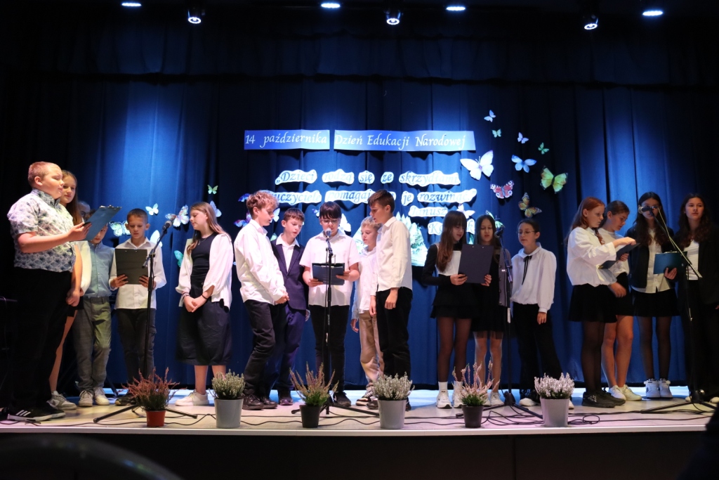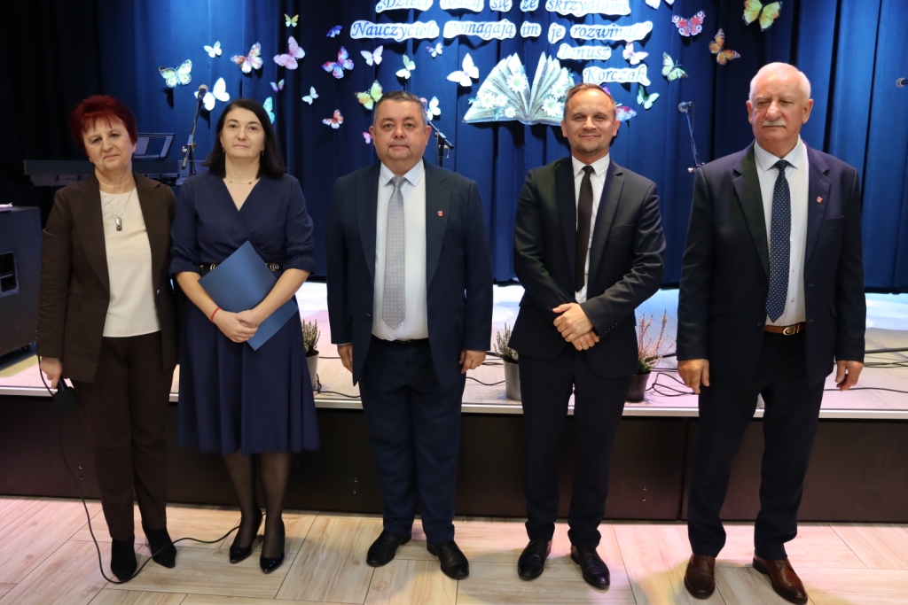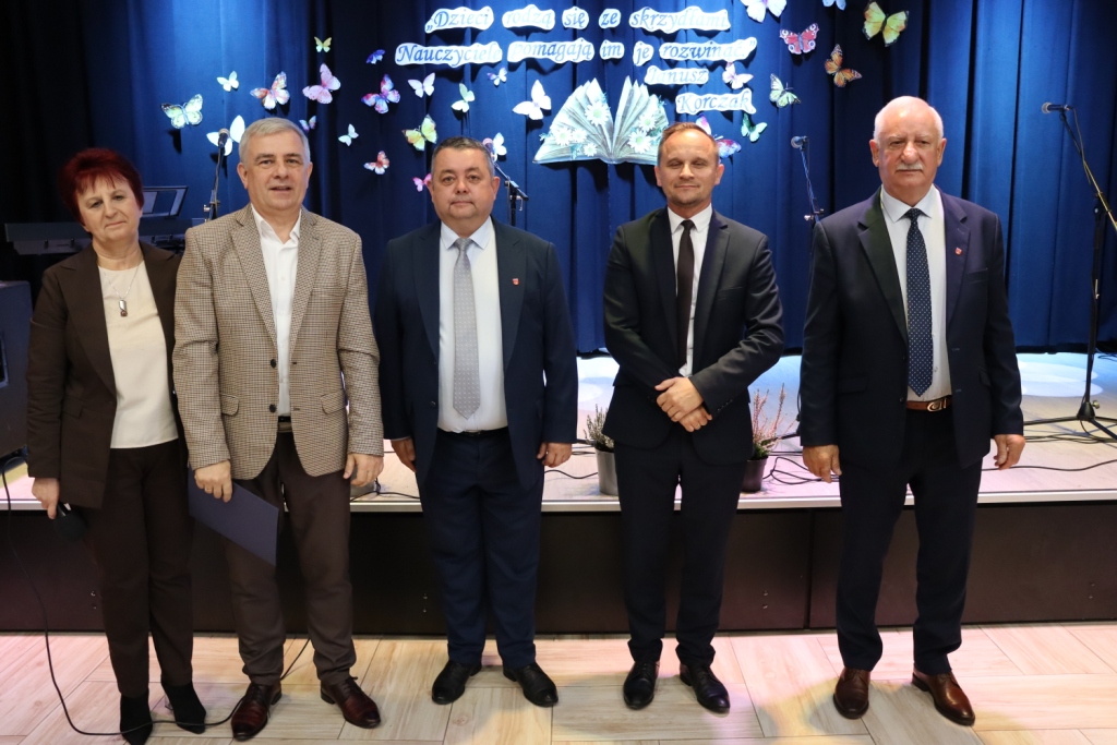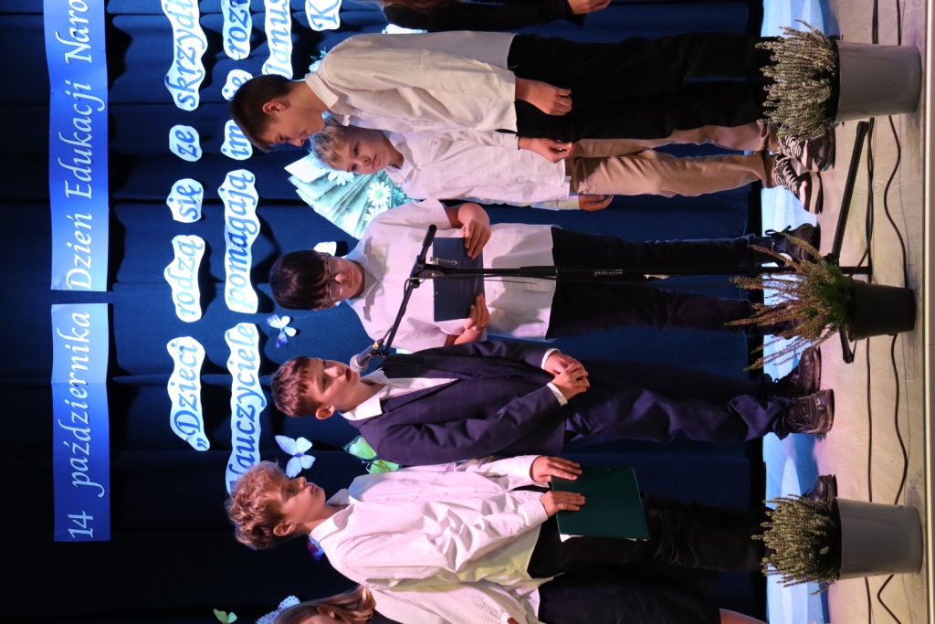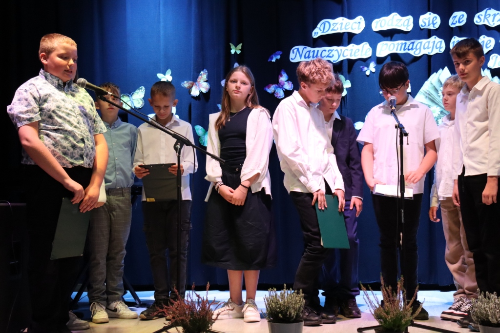 13 października w naszej szkole świętowaliśmy wspólnie Dzień Edukacji Narodowej. Wśród zaproszonych gości znaleźli się: Wójt Gminy Jarczów Pan Tomasz Tyrka wraz z Sekretarzem Gminy Panem Pawłem Mroczkowskim oraz Przewodniczącym Rady Gminy Panem Lesławem Rachańskim. Z tej okazji cała społeczność szkolna wzięła udział w uroczystej akademii, która stała się pięknym wyrazem wdzięczności wobec nauczycieli i pracowników szkoły. Uczniowie przygotowali inscenizację, w której wspaniale zaprezentowali swoje talenty recytatorskie i wokalne. Program artystyczny był pełen refleksji i ciepłych słów kierowanych do pedagogów. Uczniowie włożyli w swój występ wiele serca i zaangażowania, a ich występ został nagrodzony gromkimi brawami. Wiele ciepłych i miłych słów popłynęło w stronę nauczycieli i wszystkich pracowników szkoły. Uczniowie podkreślili swoją wdzięczność za codzienny trud, cierpliwość, troskę oraz poświęcenie, jakie nauczyciele okazują każdego dnia.Nie zabrakło również symbolicznych gestów uznania – przedstawiciele Samorządu Uczniowskiego wręczyli pedagogom słodkie upominki, dziękując im za ich pracę i serce wkładane w wychowanie młodego pokolenia. W części oficjalnej głos zabrali Pani Dyrektor Jolanta Zawiślak oraz Pan Wójt Tomasz Tyrka, którzy złożyli serdeczne życzenia wszystkim pracownikom szkoły. Podziękowali za trud, zaangażowanie i pasję w kształceniu oraz wychowaniu młodych ludzi. Ciepłe słowa wdzięczności skierowano również do pracowników administracji i obsługi, których codzienny wysiłek sprawia, że szkoła funkcjonuje sprawnie i jest miejscem przyjaznym dla całej społeczności. Uroczystość przebiegła w ciepłej, pełnej radości i wzruszeń atmosferze, pozostawiając w pamięci uczestników wiele miłych wspomnień. Serdeczne podziękowania dla Pani Katarzyny Dziura Kierownika Samorządowego Centrum Kultury w Jarczowie za udostępnienie Sali na tę uroczystość.