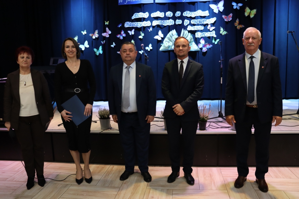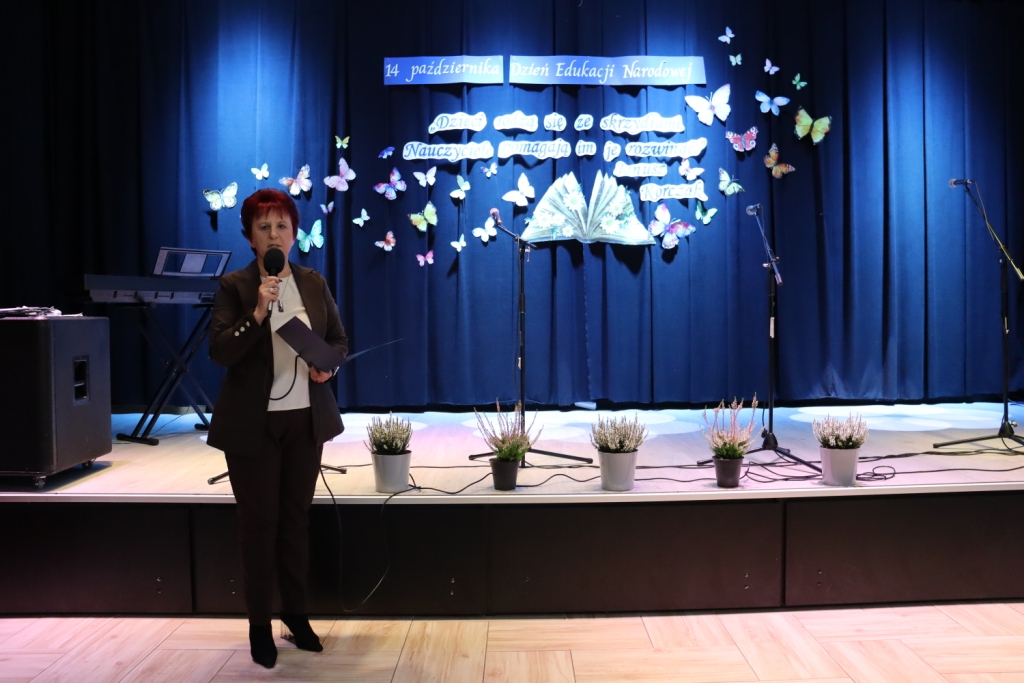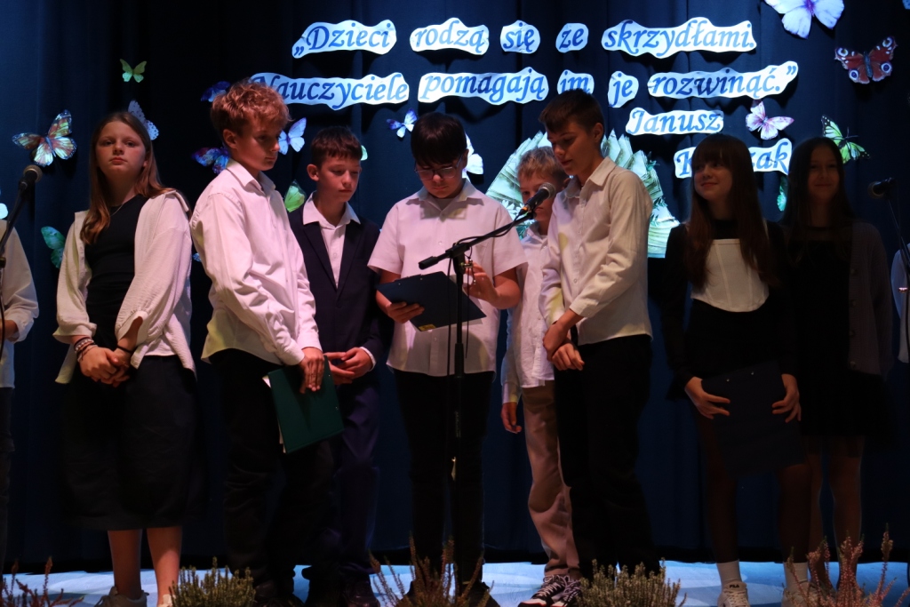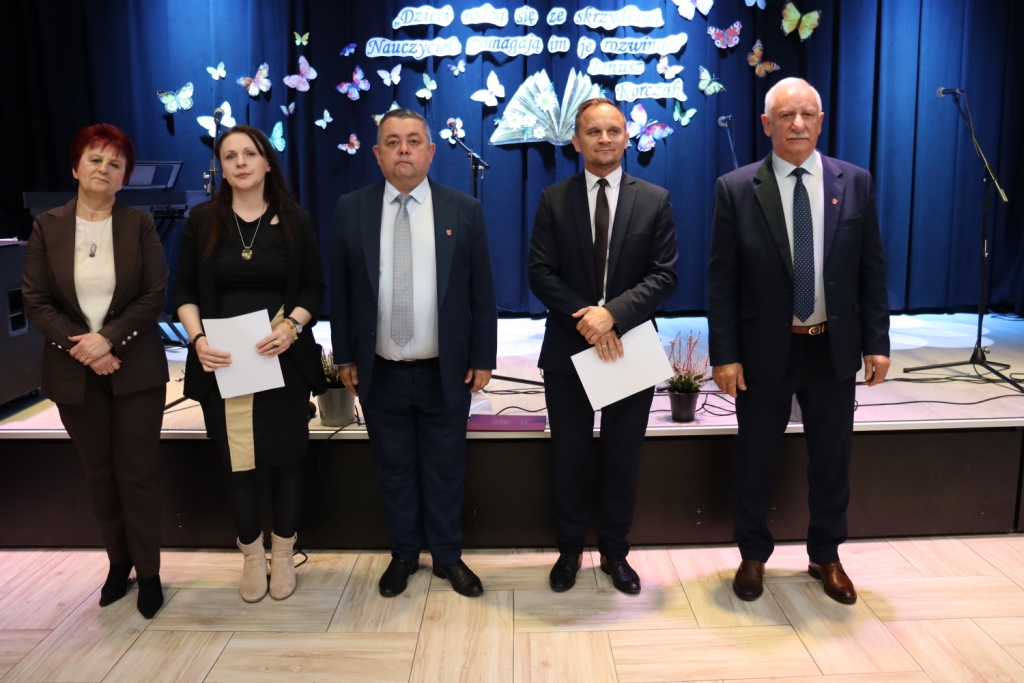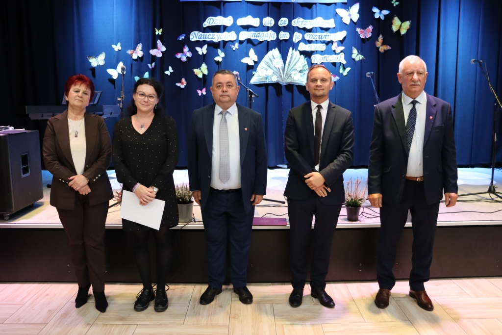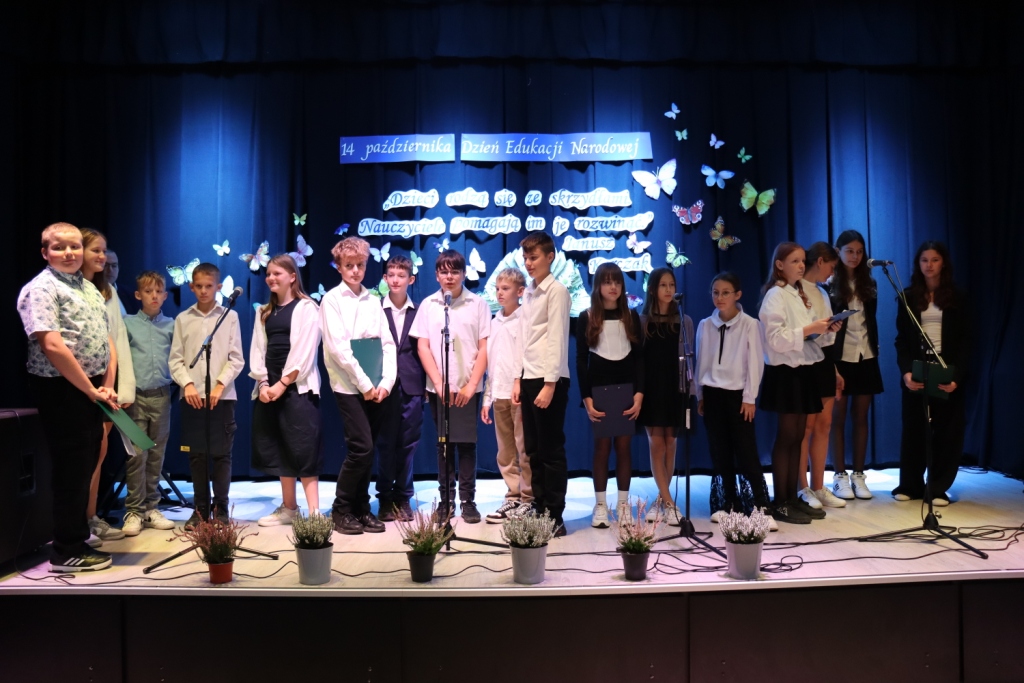 13 października w naszej szkole świętowaliśmy wspólnie Dzień Edukacji Narodowej. Wśród zaproszonych gości znaleźli się: Wójt Gminy Jarczów Pan Tomasz Tyrka wraz z Sekretarzem Gminy Panem Pawłem Mroczkowskim oraz Przewodniczącym Rady Gminy Panem Lesławem Rachańskim. Z tej okazji cała społeczność szkolna wzięła udział w uroczystej akademii, która stała się pięknym wyrazem wdzięczności wobec nauczycieli i pracowników szkoły. Uczniowie przygotowali inscenizację, w której wspaniale zaprezentowali swoje talenty recytatorskie i wokalne. Program artystyczny był pełen refleksji i ciepłych słów kierowanych do pedagogów. Uczniowie włożyli w swój występ wiele serca i zaangażowania, a ich występ został nagrodzony gromkimi brawami. Wiele ciepłych i miłych słów popłynęło w stronę nauczycieli i wszystkich pracowników szkoły. Uczniowie podkreślili swoją wdzięczność za codzienny trud, cierpliwość, troskę oraz poświęcenie, jakie nauczyciele okazują każdego dnia.Nie zabrakło również symbolicznych gestów uznania – przedstawiciele Samorządu Uczniowskiego wręczyli pedagogom słodkie upominki, dziękując im za ich pracę i serce wkładane w wychowanie młodego pokolenia. W części oficjalnej głos zabrali Pani Dyrektor Jolanta Zawiślak oraz Pan Wójt Tomasz Tyrka, którzy złożyli serdeczne życzenia wszystkim pracownikom szkoły. Podziękowali za trud, zaangażowanie i pasję w kształceniu oraz wychowaniu młodych ludzi. Ciepłe słowa wdzięczności skierowano również do pracowników administracji i obsługi, których codzienny wysiłek sprawia, że szkoła funkcjonuje sprawnie i jest miejscem przyjaznym dla całej społeczności. Uroczystość przebiegła w ciepłej, pełnej radości i wzruszeń atmosferze, pozostawiając w pamięci uczestników wiele miłych wspomnień. Serdeczne podziękowania dla Pani Katarzyny Dziura Kierownika Samorządowego Centrum Kultury w Jarczowie za udostępnienie Sali na tę uroczystość.