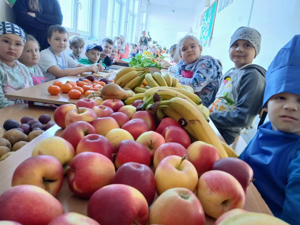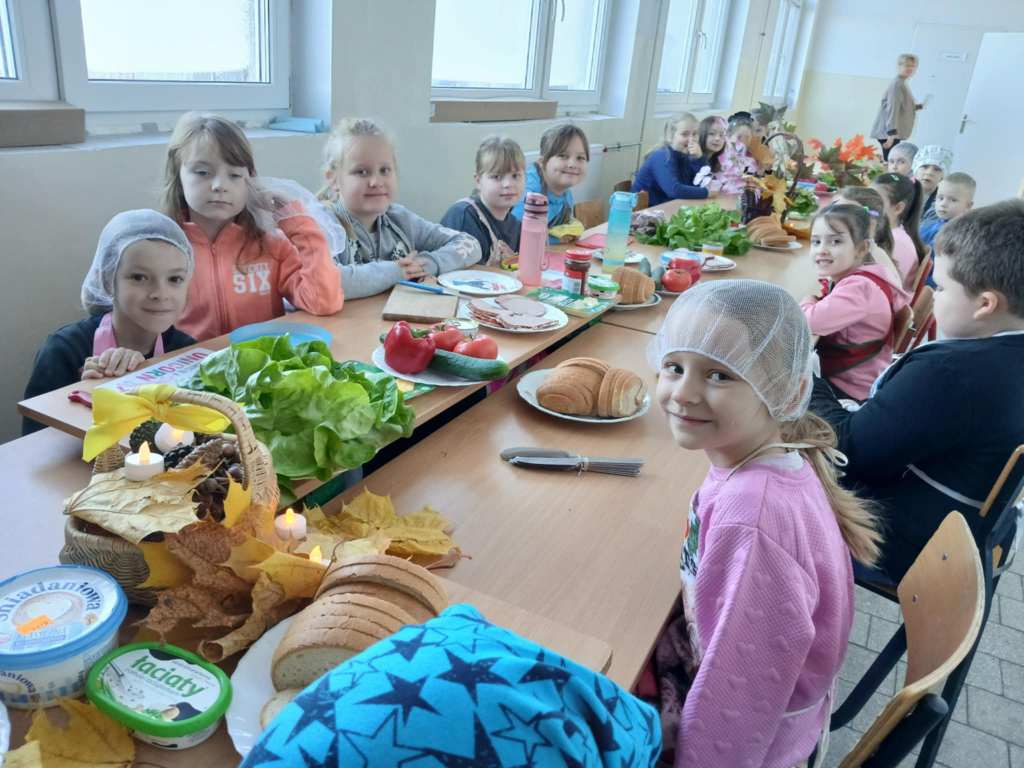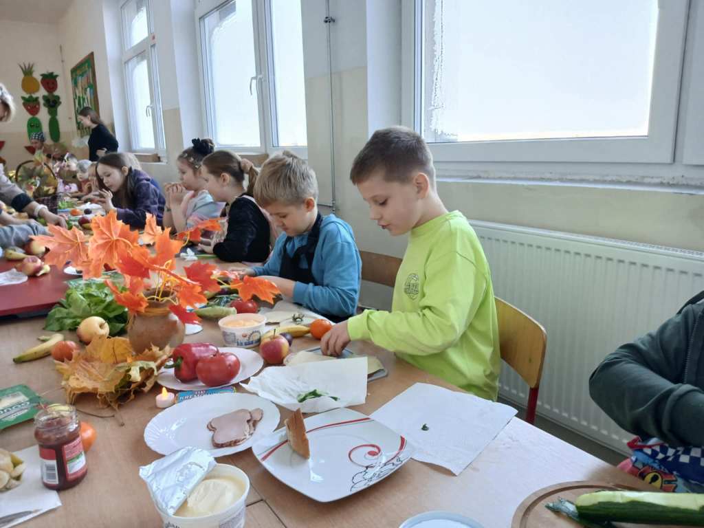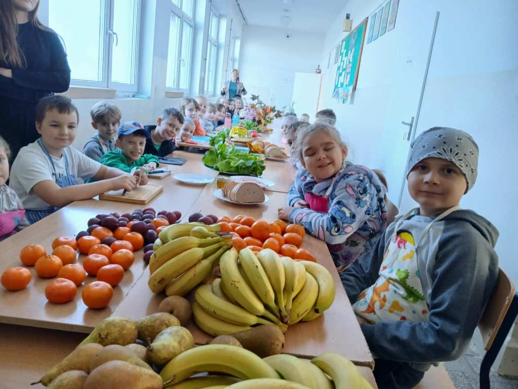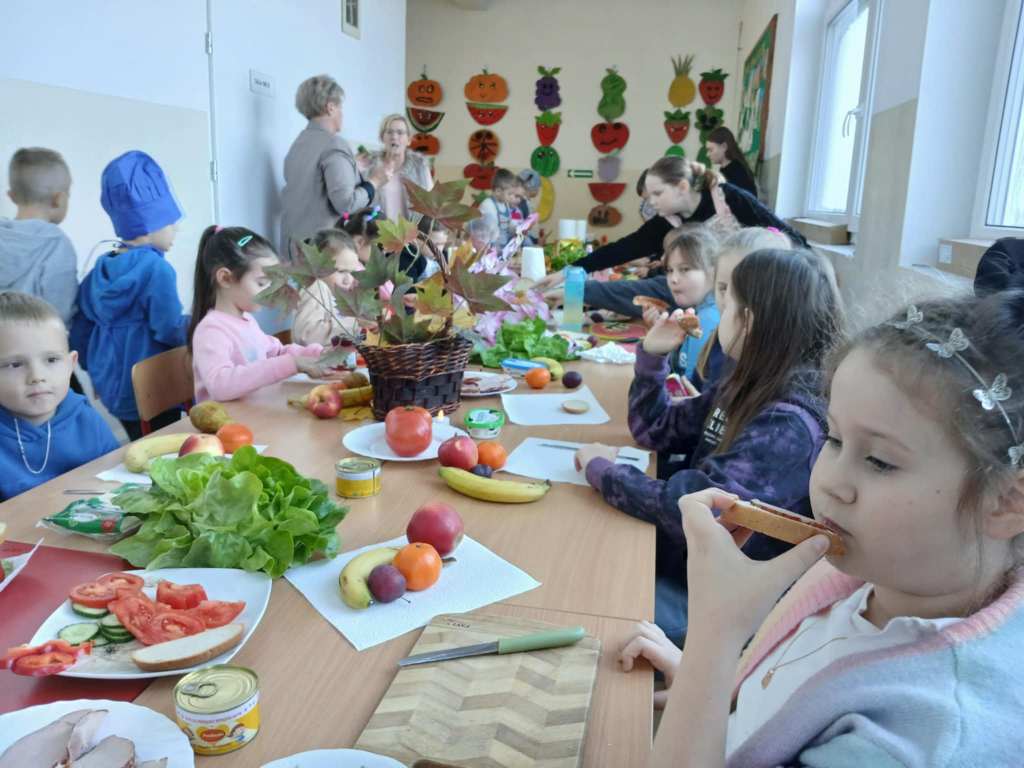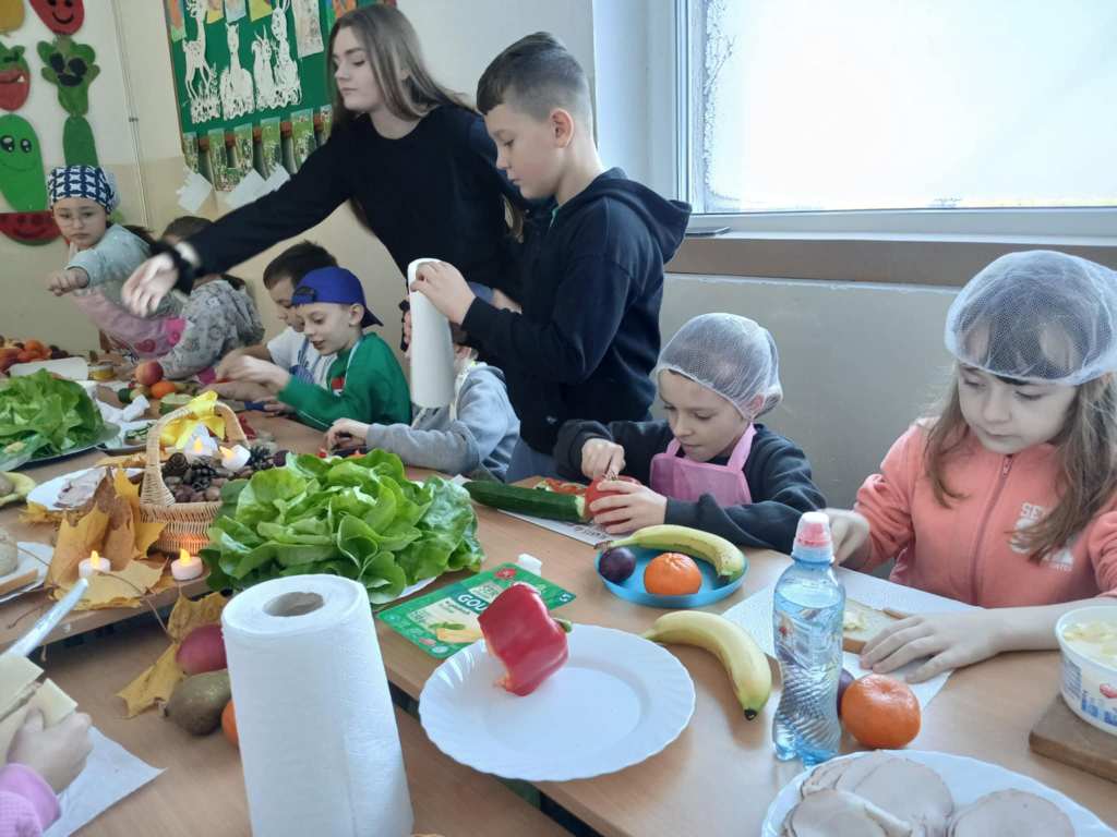 W dniu 21 października 2025 roku uczniowie klas I–III wzięli udział w obchodach Dnia Zdrowego Żywienia. Celem tego wydarzenia było przypomnienie, jak ważne jest codzienne dbanie o zdrowe odżywianie oraz kształtowanie prawidłowych nawyków żywieniowych już od najmłodszych lat. Uczniowie klasy II przygotowali krótką inscenizację o warzywach, natomiast uczniowie klasy III wykonali „Owocową ściankę”. Dzieci samodzielnie przygotowywały kolorowe, zdrowe kanapki z warzywami, serem i wędliną, a następnie wspólnie je degustowali. Na stole nie zabrakło także świeżych owoców – jabłek, bananów, gruszek, mandarynek i śliwek, które wszyscy zajadali ze smakiem. Wspólny posiłek przebiegał w miłej i radosnej atmosferze. Dzieci przekonały się, że zdrowe jedzenie może być nie tylko pożywne, ale również bardzo smaczne i kolorowe. Dzień Zdrowego Żywienia był doskonałą okazją do nauki poprzez zabawę i do wspólnego promowania zdrowego stylu życia.
