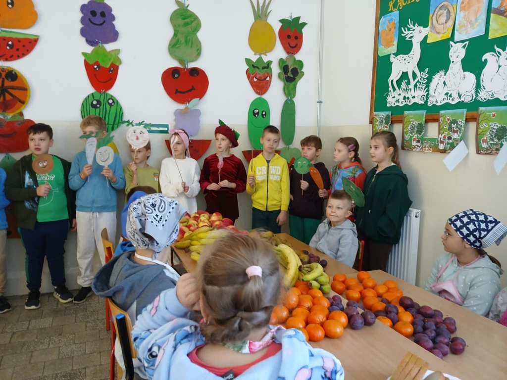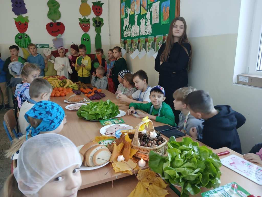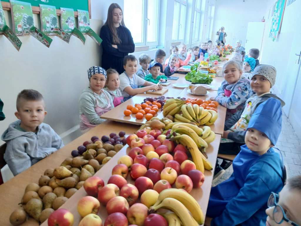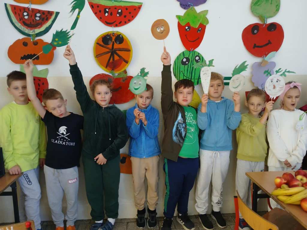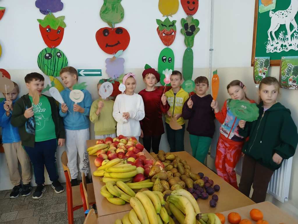 W dniu 21 października 2025 roku uczniowie klas I–III wzięli udział w obchodach Dnia Zdrowego Żywienia. Celem tego wydarzenia było przypomnienie, jak ważne jest codzienne dbanie o zdrowe odżywianie oraz kształtowanie prawidłowych nawyków żywieniowych już od najmłodszych lat. Uczniowie klasy II przygotowali krótką inscenizację o warzywach, natomiast uczniowie klasy III wykonali „Owocową ściankę”. Dzieci samodzielnie przygotowywały kolorowe, zdrowe kanapki z warzywami, serem i wędliną, a następnie wspólnie je degustowali. Na stole nie zabrakło także świeżych owoców – jabłek, bananów, gruszek, mandarynek i śliwek, które wszyscy zajadali ze smakiem. Wspólny posiłek przebiegał w miłej i radosnej atmosferze. Dzieci przekonały się, że zdrowe jedzenie może być nie tylko pożywne, ale również bardzo smaczne i kolorowe. Dzień Zdrowego Żywienia był doskonałą okazją do nauki poprzez zabawę i do wspólnego promowania zdrowego stylu życia.