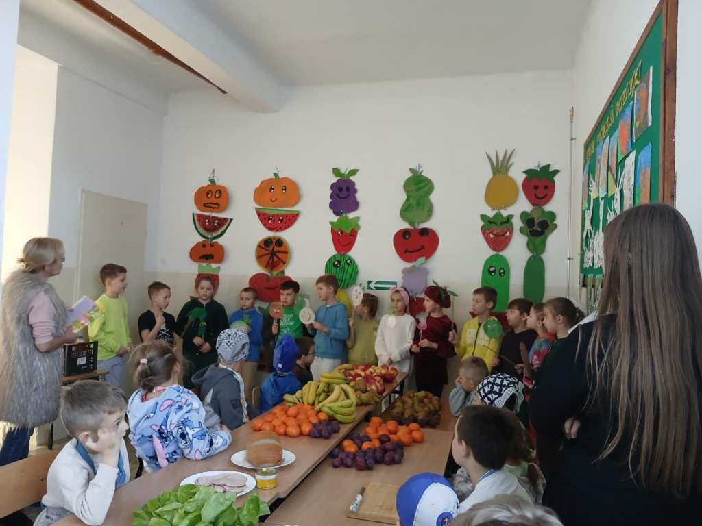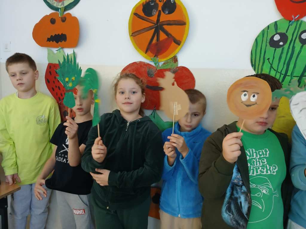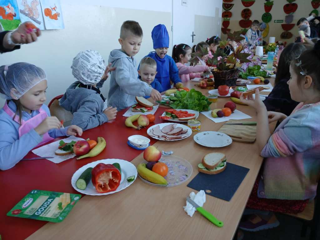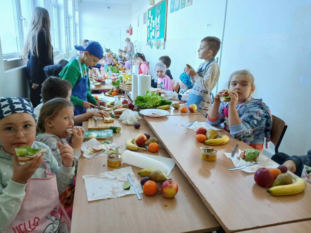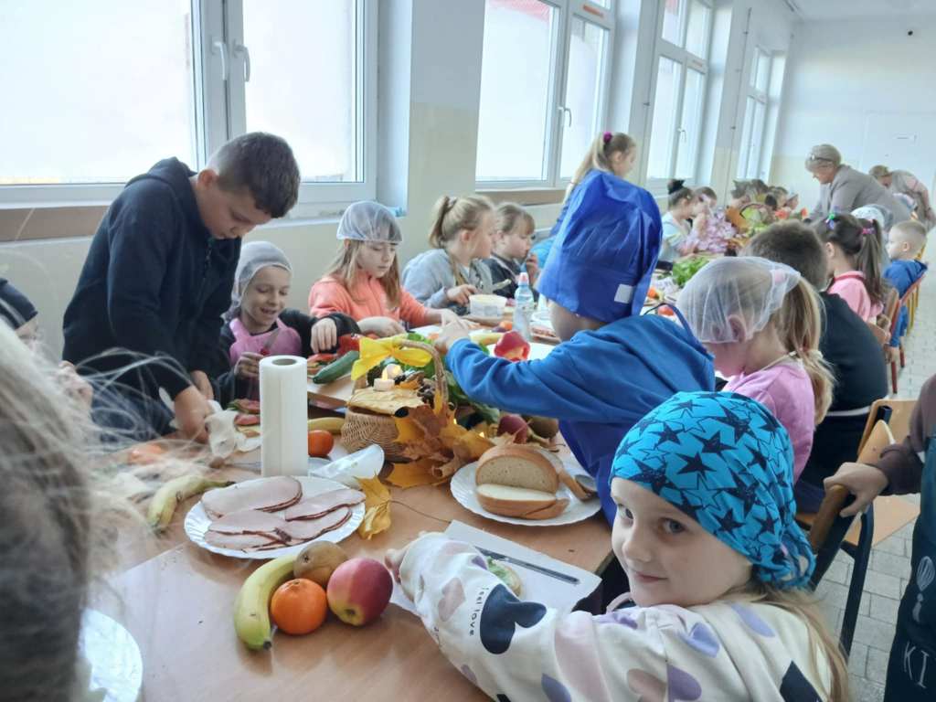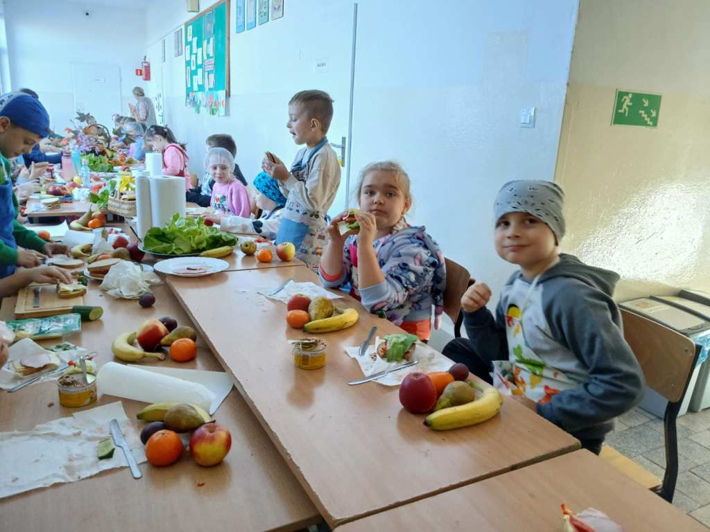 W dniu 21 października 2025 roku uczniowie klas I–III wzięli udział w obchodach Dnia Zdrowego Żywienia. Celem tego wydarzenia było przypomnienie, jak ważne jest codzienne dbanie o zdrowe odżywianie oraz kształtowanie prawidłowych nawyków żywieniowych już od najmłodszych lat. Uczniowie klasy II przygotowali krótką inscenizację o warzywach, natomiast uczniowie klasy III wykonali „Owocową ściankę”. Dzieci samodzielnie przygotowywały kolorowe, zdrowe kanapki z warzywami, serem i wędliną, a następnie wspólnie je degustowali. Na stole nie zabrakło także świeżych owoców – jabłek, bananów, gruszek, mandarynek i śliwek, które wszyscy zajadali ze smakiem. Wspólny posiłek przebiegał w miłej i radosnej atmosferze. Dzieci przekonały się, że zdrowe jedzenie może być nie tylko pożywne, ale również bardzo smaczne i kolorowe. Dzień Zdrowego Żywienia był doskonałą okazją do nauki poprzez zabawę i do wspólnego promowania zdrowego stylu życia.