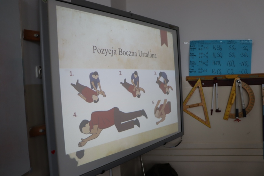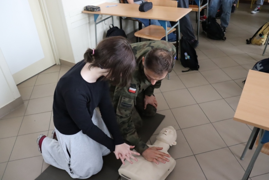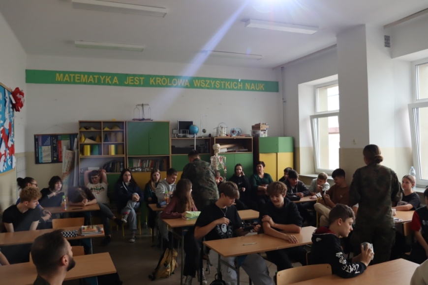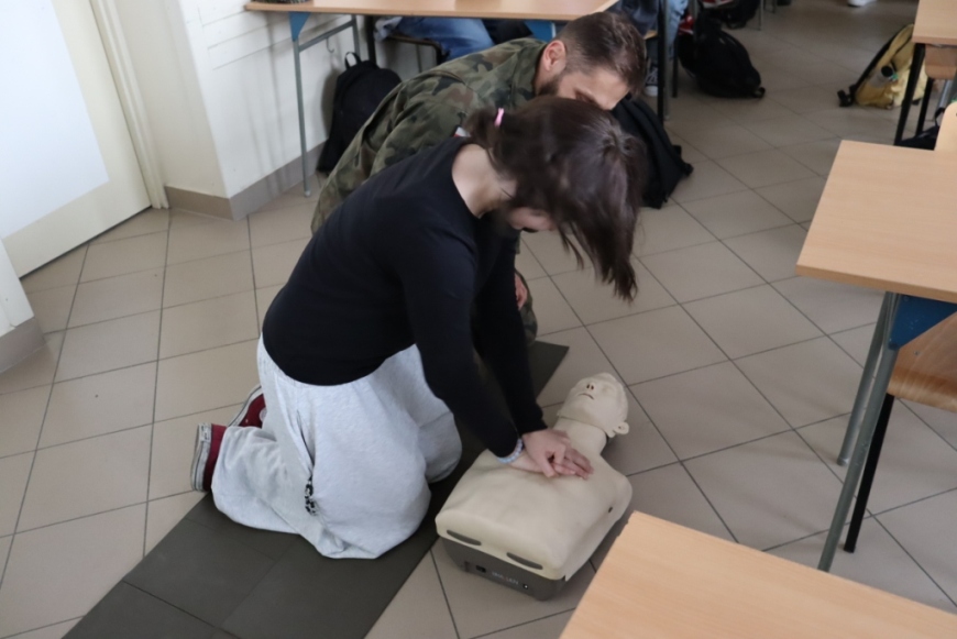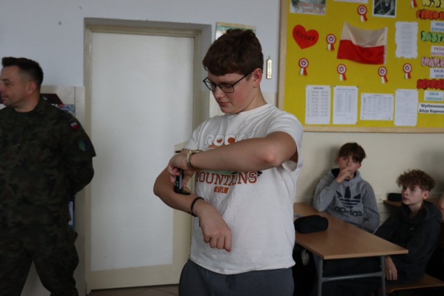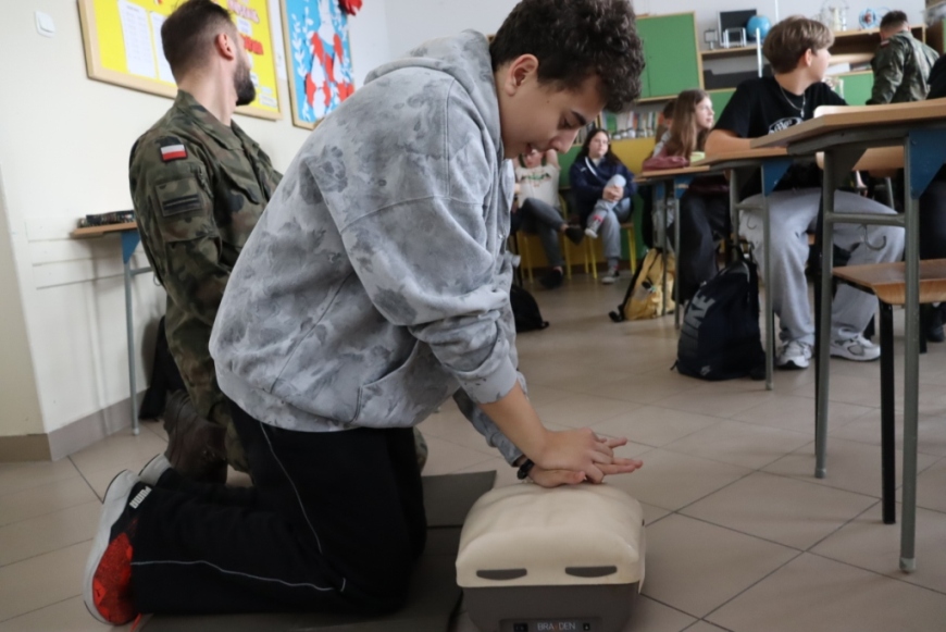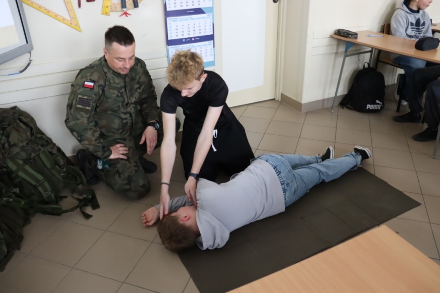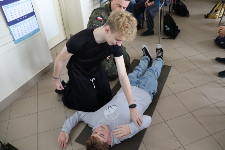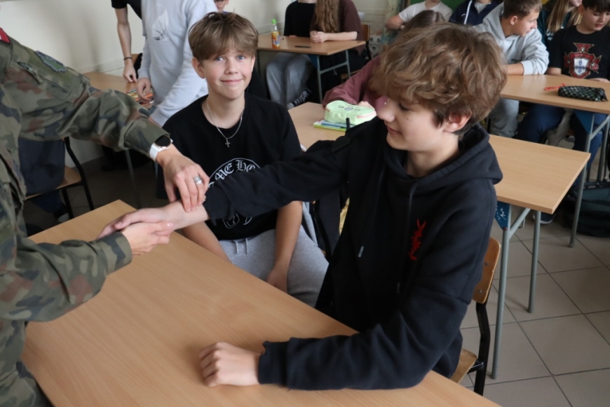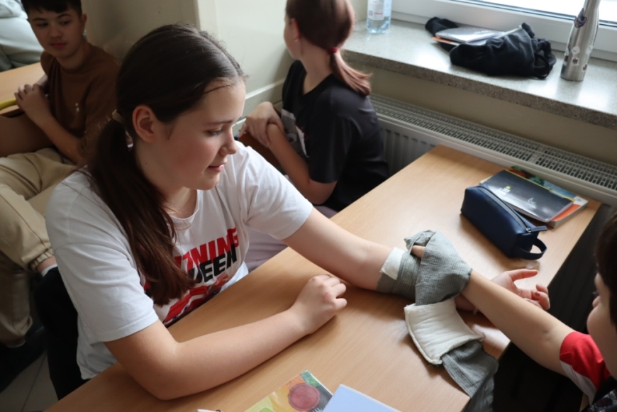 Uczniowie aktywnie uczestniczyli w zajęciach, zadawali pytania i brali udział w krótkich ćwiczeniach praktycznych, m.in. w pokazie RKO oraz w nauce zakładania opatrunków i opasek uciskowych. Spotkanie zakończyło się wspólnym podsumowaniem i zachętą do dalszego pogłębiania wiedzy na temat bezpieczeństwa i odpowiedzialnego zachowania w sytuacjach zagrożenia.