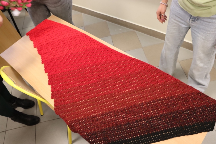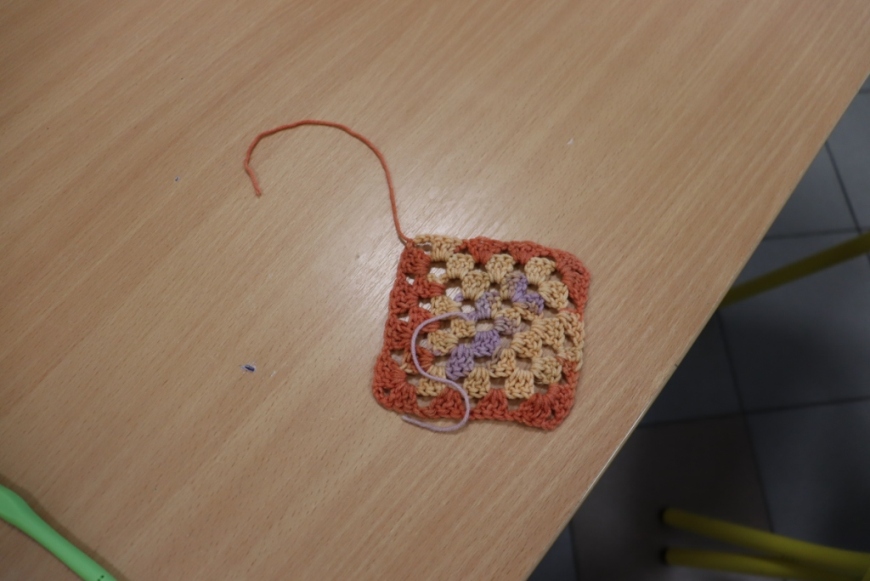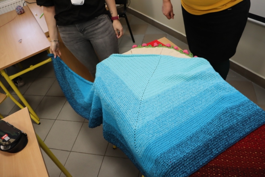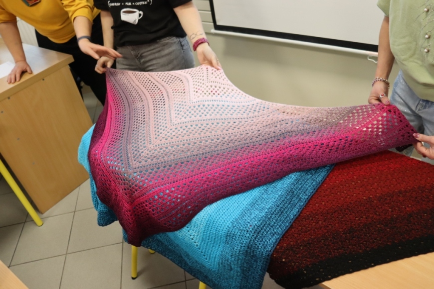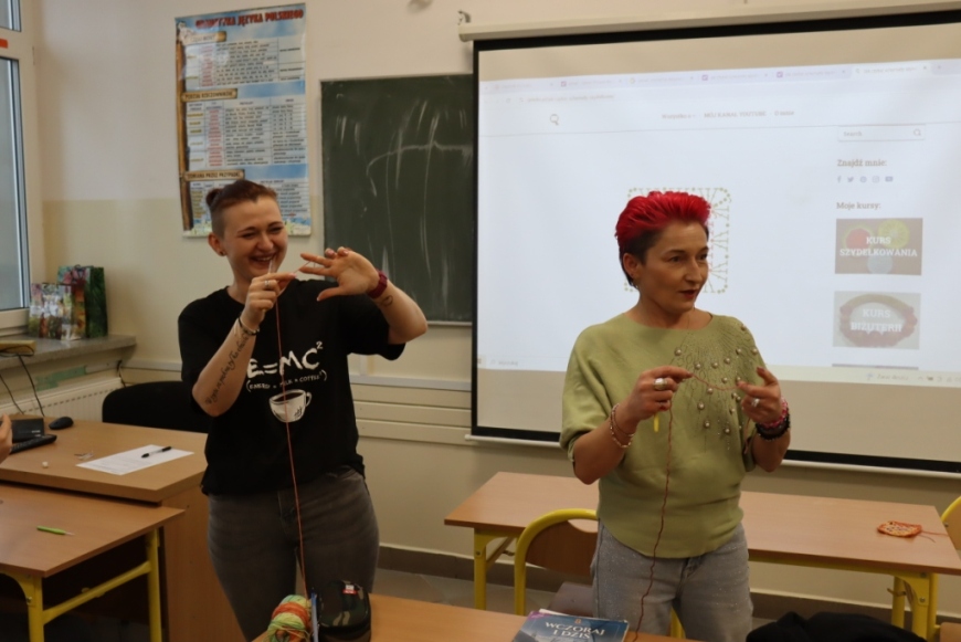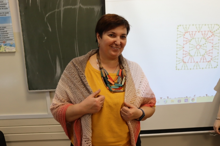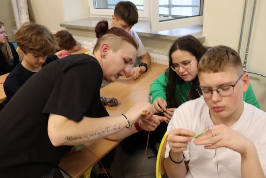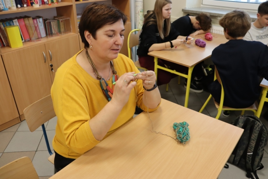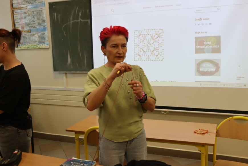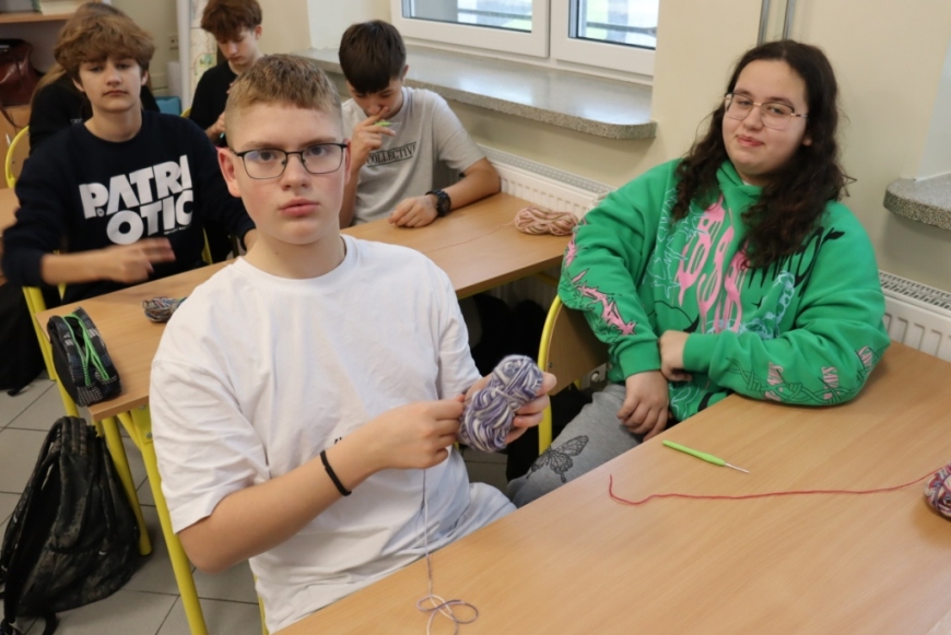 Uczniowie mieli okazję pracować z schematem szydełkowym wyświetlonym na tablicy, ucząc się odczytywania symboli, planowania kolejnych kroków oraz liczenia potrzebnych oczek. Dzięki wspólnej pracy powstały pierwsze, samodzielnie wykonane fragmenty robótek, a uczestnicy przekonali się, że matematyka może być nie tylko nauką ścisłą, lecz także inspiracją do twórczego działania.