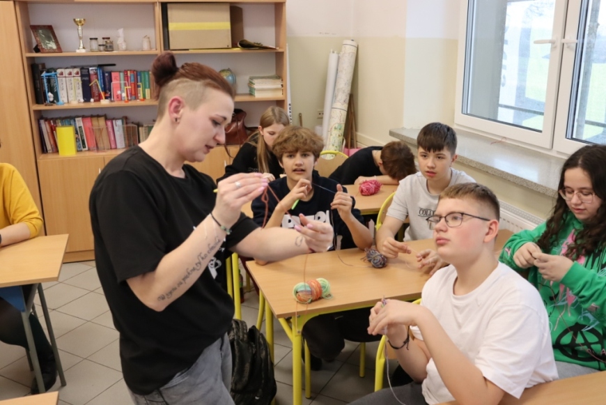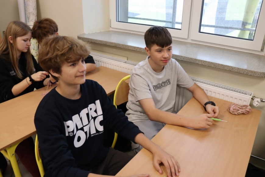 Podczas zajęć z kreatywnej matematyki w klasie ósmej odbyły się wyjątkowe warsztaty hafciarskie realizowane w ramach innowacji „Matematyczne szydełko”. Zajęcia poprowadziły dwie mamy uczniów, które wprowadziły młodzież w podstawy szydełkowania oraz pokazały, w jaki sposób techniki rękodzielnicze mogą łączyć się z elementami matematyki.