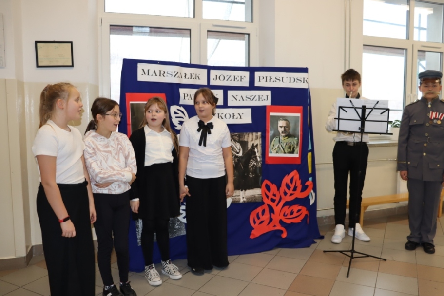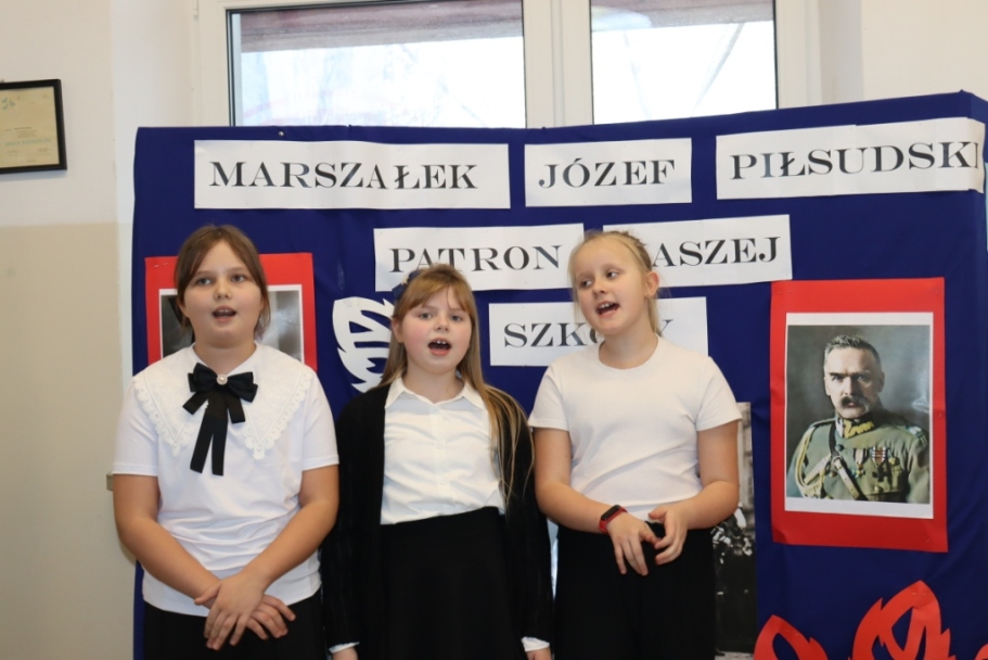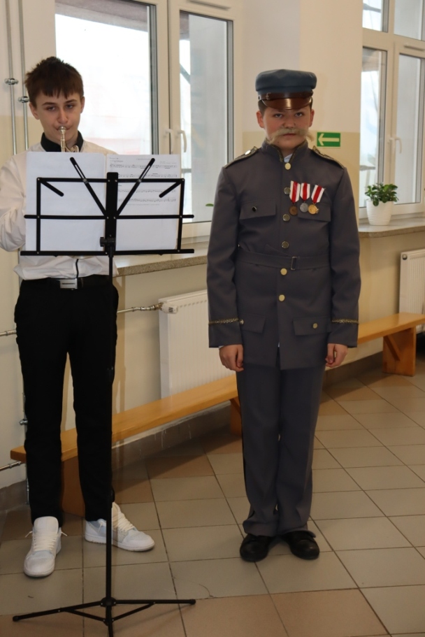 Uroczystość rozpoczęła się nietypowo, bo zamiast suchych dat i podręcznikowych informacji usłyszeliśmy serię ciekawostek z życia Marszałka. I nagle okazało się, że Józef Piłsudski to nie tylko surowy dowódca z wąsem, ale także człowiek z pasjami, przywarami i poczuciem humoru. Jego sylwetkę przybliżyli nam ósmoklasiści – Amelka Kusz i Kuba Tkaczyk.