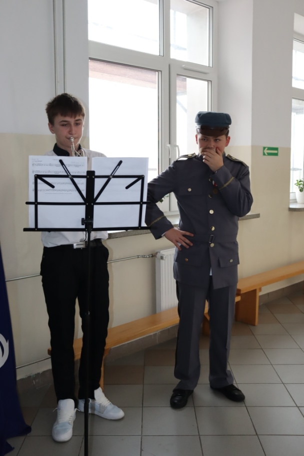 Kiedy już nasyciliśmy się historią, przyszła pora na muzykę. Minikoncert pieśni legionowych w wykonaniu Filipa Monastyrskiego zabrzmiał wyjątkowo. Trąbka, choć samotna, wypełniła szkolne korytarze brzmieniem jak z dawnych pól marszowych. Utwory, które niegdyś dodawały otuchy żołnierzom, dziś poruszyły szkolną publiczność i na moment przeniosły ją w czasy, gdy słowa „Honor” i „Ojczyzna” miały zupełnie inny wymiar.