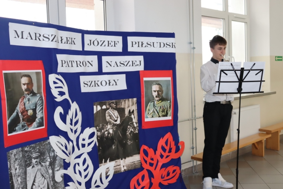 Największą atrakcją obchodów Święta Patrona Szkoły okazał się jednak… sam Marszałek. A właściwie jego współczesna, szkolna wersja — uczeń przebrany tak przekonująco, że nawet najwierniejsi pasjonaci historii zaczynali się zastanawiać, czy aby na pewno Piłsudski nie znalazł sposobu na podróże w czasie. Wąs prezentował się imponująco, mundur działał na wyobraźnię, a poza „patrzę w przyszłość narodu” mogłaby trafić na okładkę podręcznika. Nic dziwnego, że Marszałek – w tej roli wystąpił Jakub Tkaczyk – budził zainteresowanie uczniów. Na zakończenie uroczystości głos zabrała pani dyrektor, która podkreśliła rolę Marszałka Piłsudskiego w odzyskaniu przez Polskę niepodległości.